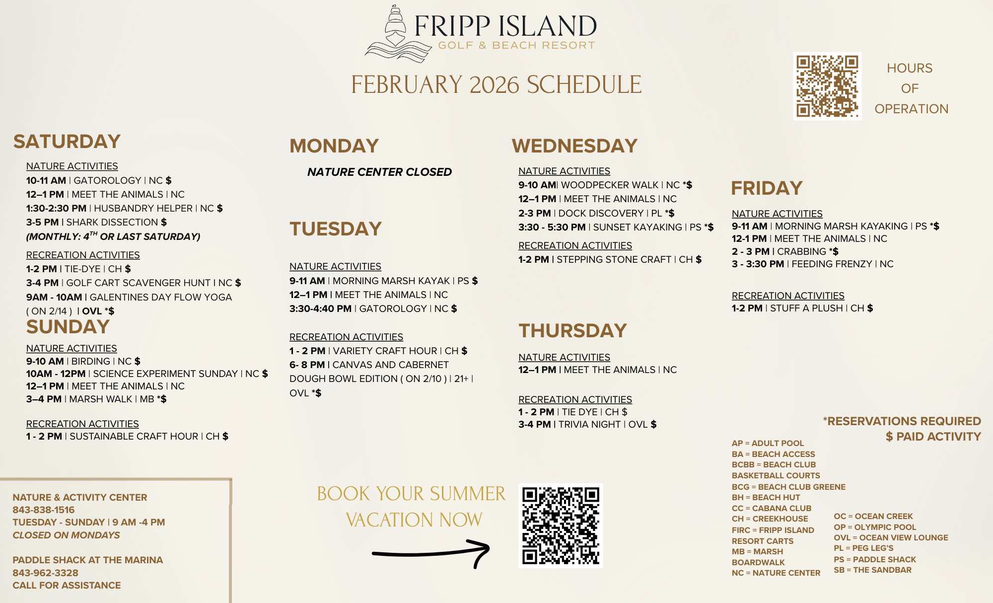 While Fripp is one of the very most beloved of all South Carolina Resorts, there is way more to Fripp Island wildlife than most people realize - learn how much more with our Nature Programs. Discover the wildlife with the assistance of our Naturalist and staff. Most programs will meet at the Nature Center, and space may be limited for some programs, so plan on calling ahead to secure your spot. Please sign in before the programs begin so we can start as soon as possible.
