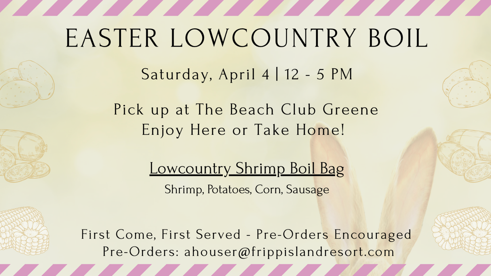- 12 - 5 PM | Lowcountry Boil Pick Up | Beach Club Greene | $* (Preorder by 4/3 at 12pm)