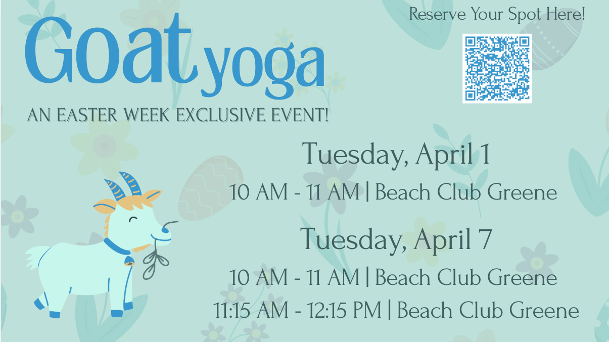 - 11:15 AM - 12:15 PM | Goat Yoga | Beach Club Greene | $* | Book Here!