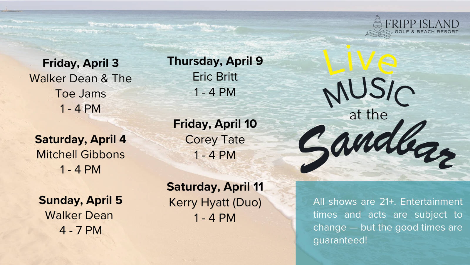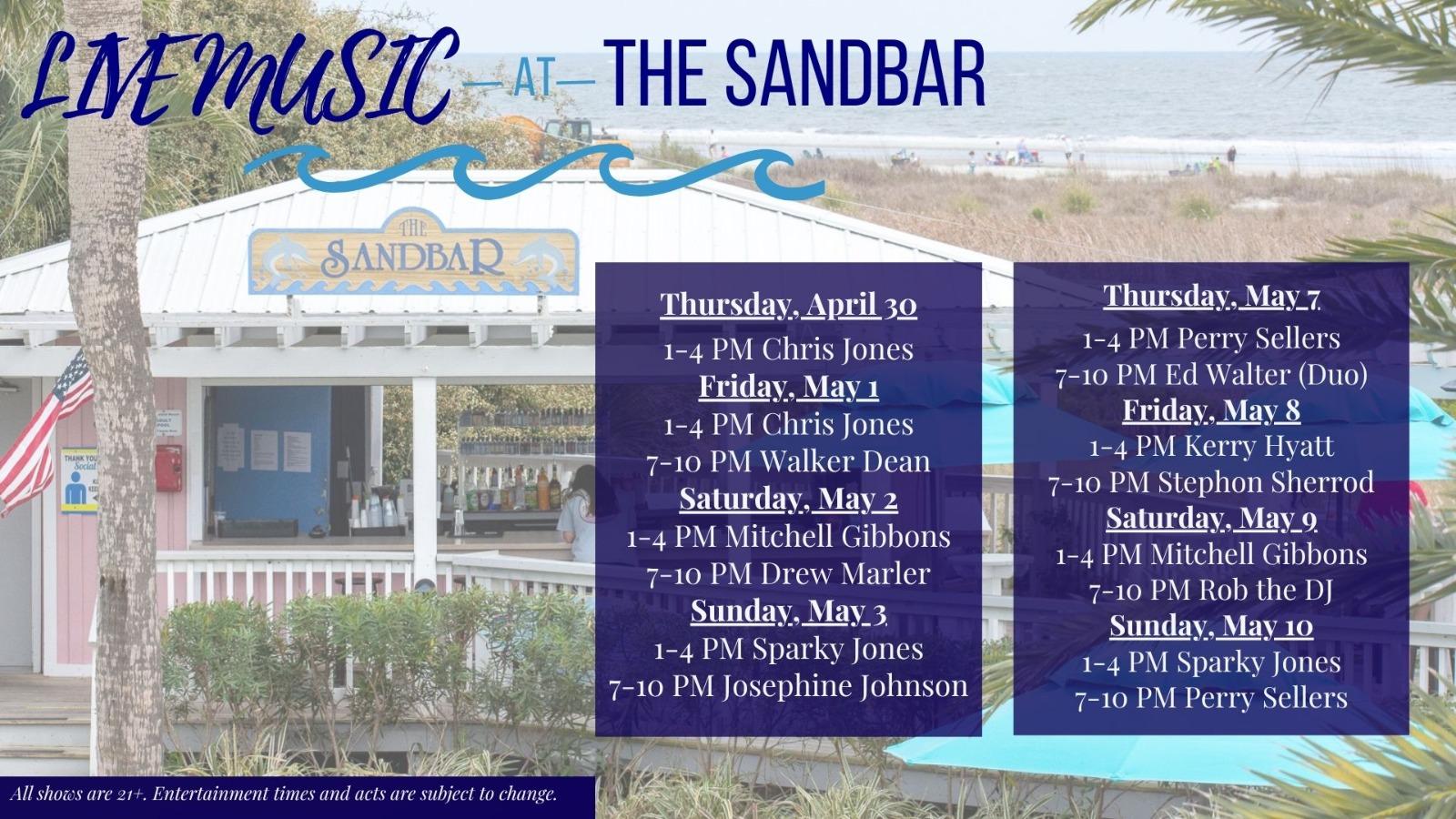 Join for Live Entertainment at The Sandbar! The musician schedule varies, so see below for more details on when your favorite artists are playing!